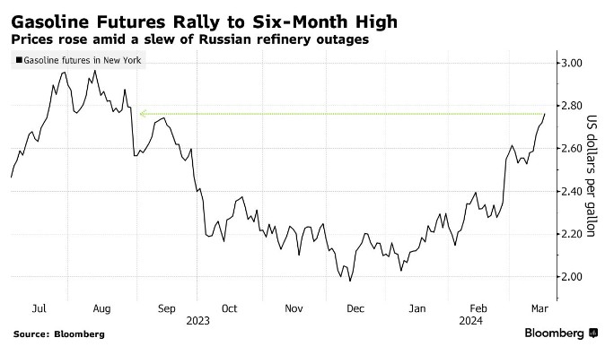 由于俄罗斯炼油厂的供应中断,以及美国燃料库存的减少加剧了对夏季驾驶月份到来之前的供应担忧,美国汽油期货触及六个月高点。