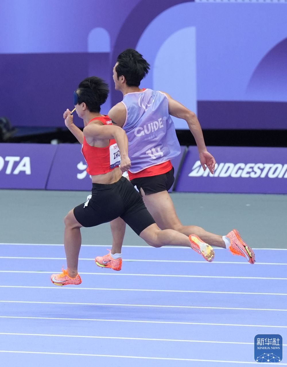 ↑中国队第一棒选手周国华(左)与领跑员贾登璞在预赛中。